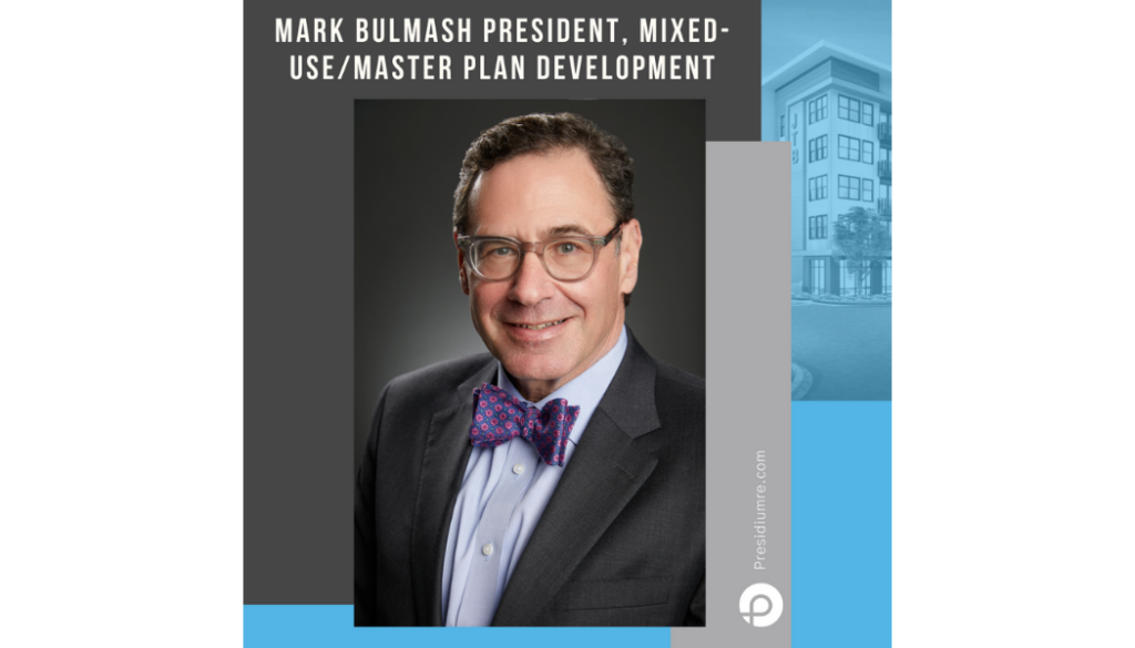 Presidium, a diversified real estate development, investment and management firm, has selected Mark Bulmash as President, Mixed-Use/Master Plan Development. In his role with Presidium, Bulmash will guide the development of quality assets that are well-positioned within a thoughtfully executed mixed-use environment, leading to greater stability, positive community impact, and increased investment value.